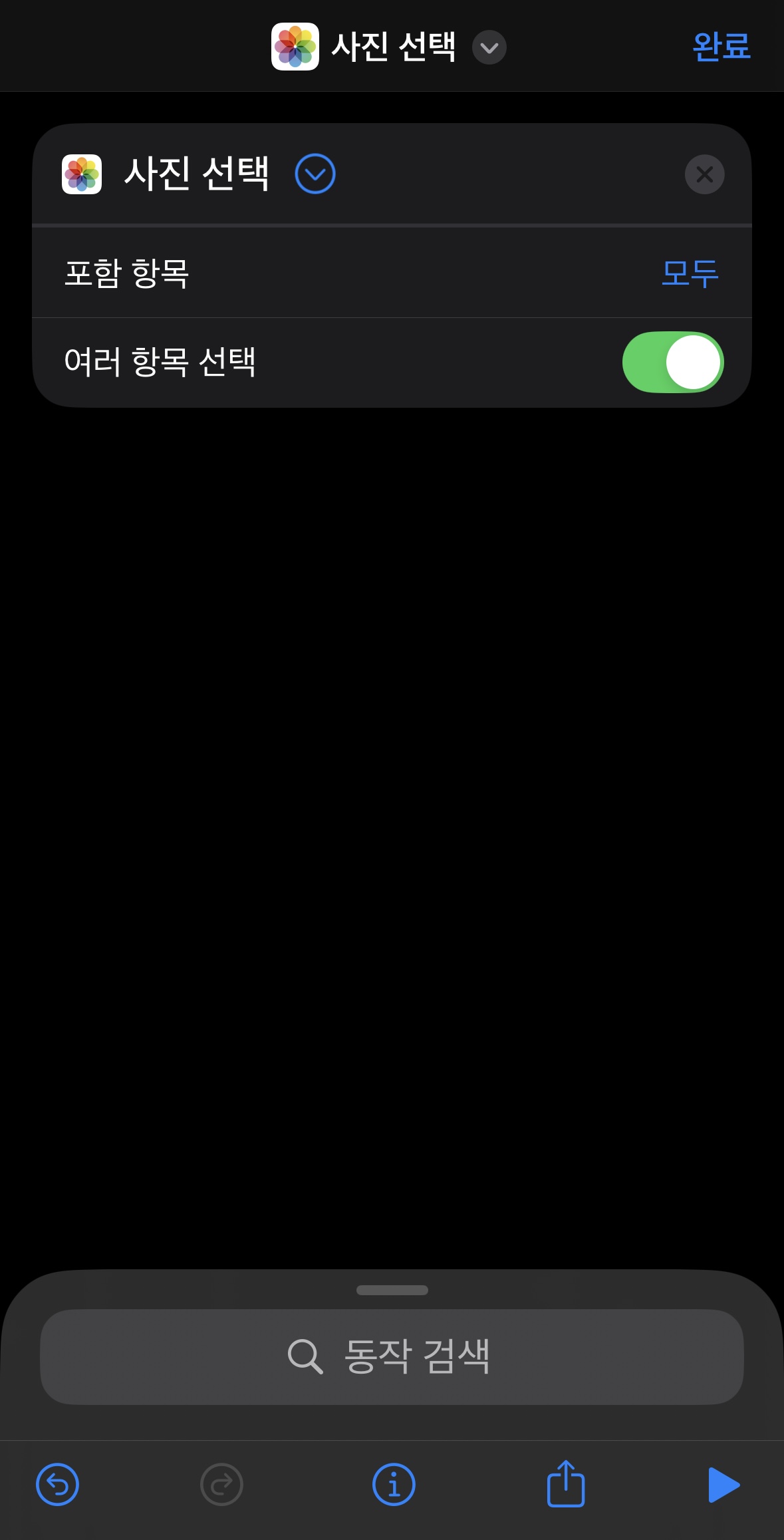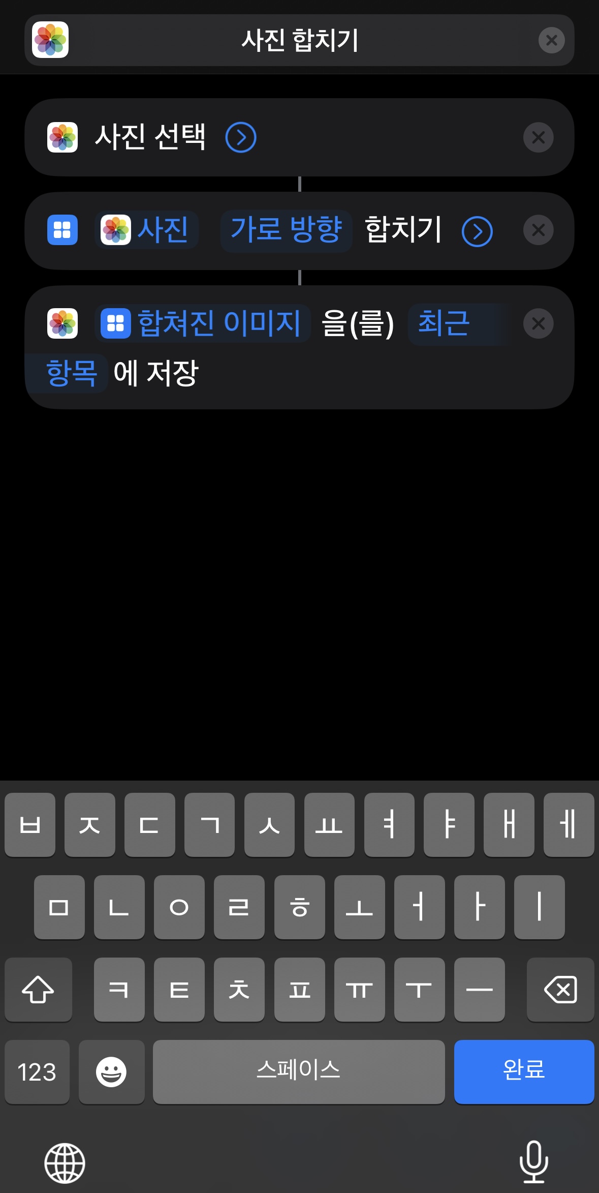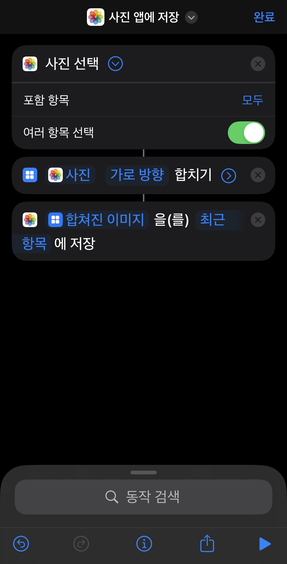 이렇게 하여, 3초면은 실행 가능한 아이폰 사진 합치기 단축어가 완성되었습니다.